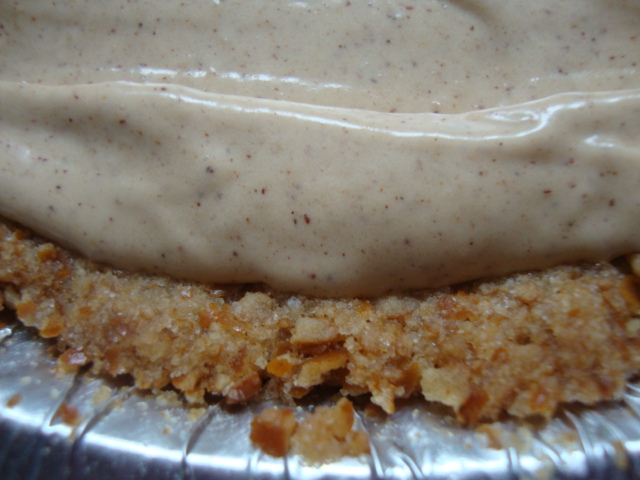 - Pour filling into cooled pretzel crust, using a spatula to spread it in an even layer.