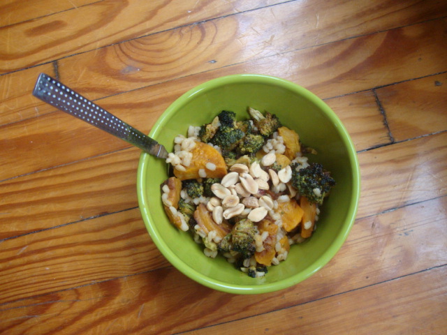 I love storing leftovers in tupperware because when you are combining you can shake things together to get a really good mix. This time I shook barley, roasted broccoli, roasted butternut squash, and Wegman’s Thai Peanut Sauce. Topped with a few cocktail peanuts.