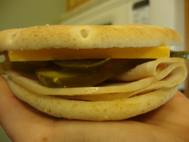 A Sandwich Thin topped with Applegate Farms roasted turkey, sharp cheddar, and tons of sliced sweet pickles.