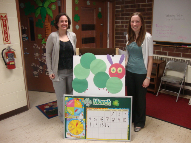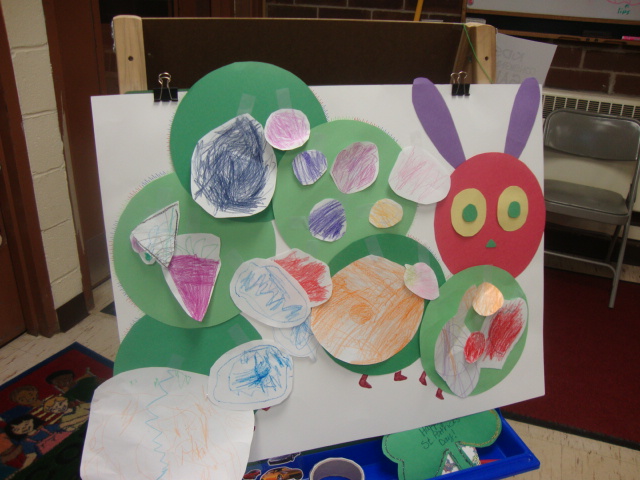 Actually I was a bit too dressy; all of the real teachers were in jeans! My friend Kim and I did a nutrition education activity with 17 pre-k kids today. We talked about fruits and vegetables, read Eric Carle’s The Very Hungry Caterpillar, and then had the kids draw their favorite fruits and veggies to feed to the hungry caterpillar.