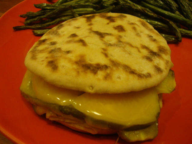 I piled 2 oz of Applegate Farm’s Honey and Maple Turkey Breast, 2 oz of Cabot’s 50% Reduced Fat Sharp Cheddar Cheese, and a sort of disgusting amount of sweet pickle slices on a Wegman’s Sandwich Thin and then wrapped the whole thing in foil and stuck it in the oven to get melty.