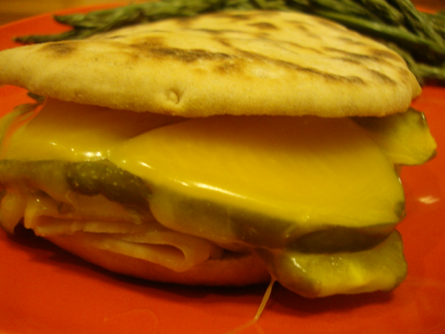 Dee-lish-us! Cheese and pickles is the new cheese and jam. I generally use full-fat cheese (other than what we buy shredded) but going 50% reduced here lets me use enough that the cheese is a major sandwich component. And the Cabot is pretty spot on with texture and flavor.