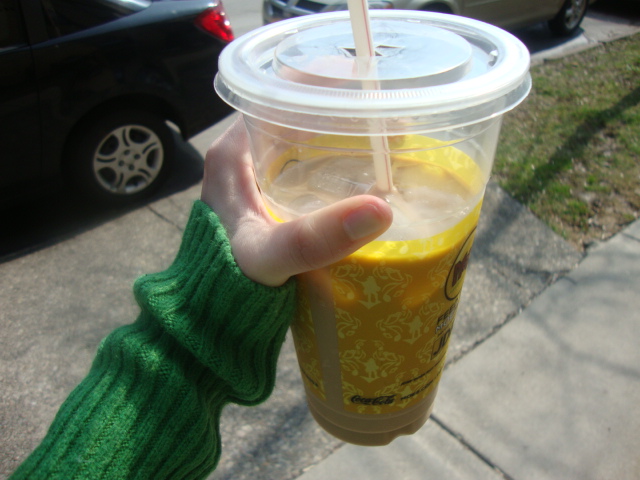 I enjoyed my beverage on a walk with the husband and the dog.  It was warm enough to do this –