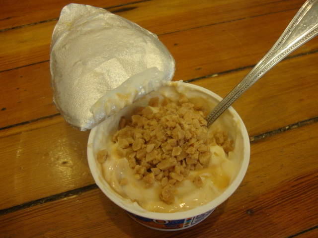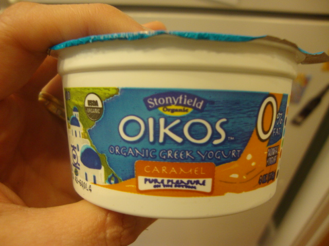 and a 0% Oikos Greek Yogurt with Caramel on the bottom.
