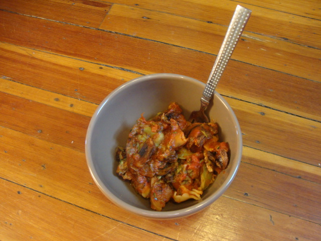 Tricolor six cheese tortellini with marinara sauce, and roasted sliced mushrooms and shredded zucchini.