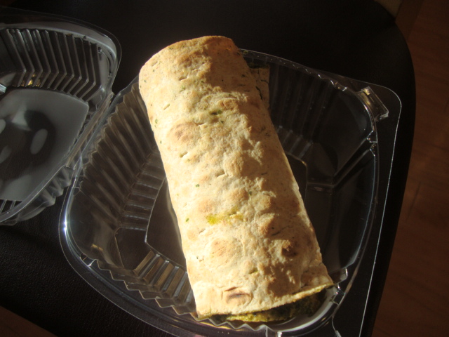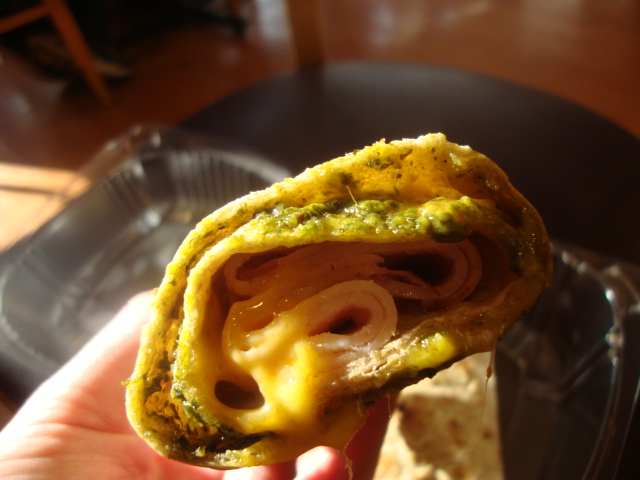 “Bourbon maple turkey, cheddar cheese, and herb and spinach spread on a whole wheat lavish bread.”
