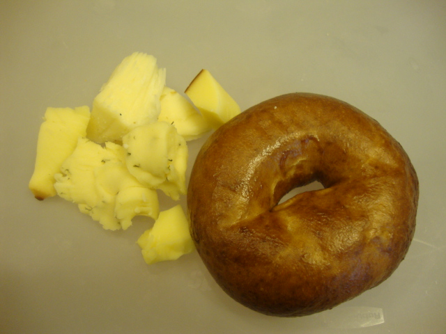A mini pretzel bagel with some of the leftover cheese from last night’s cheese plate.