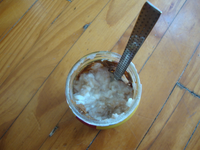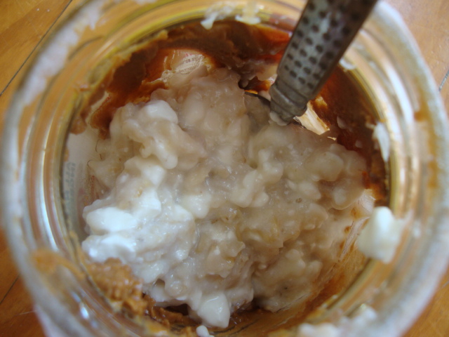 Another round of oats in a jar, this time hot oatmeal with cottage cheese in a Biscoff Crunchy jar.