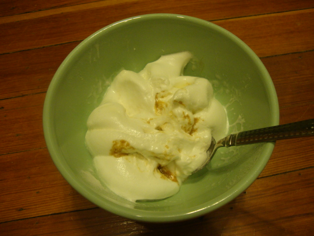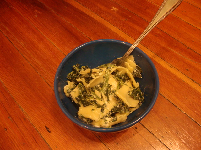 I gave the chopped noodles a quick stir-fry with 1 Tbsp canola oil, 2 cups frozen spinach, and 4 oz cream goat cheese. Half of the finished product went into a tupperware for tomorrow and the other half went into my belly.