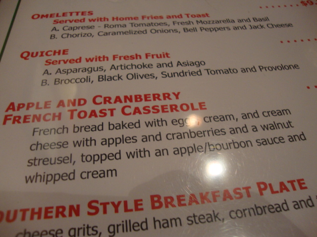 Corn and poblano peppers topped with runny eggs sounds like heaven on a plate, but sadly they had run out.  I ended up making a last-minute decision and choosing the apple and cranberry french toast streusel casserole.
