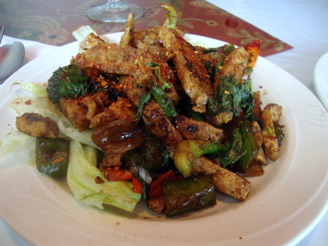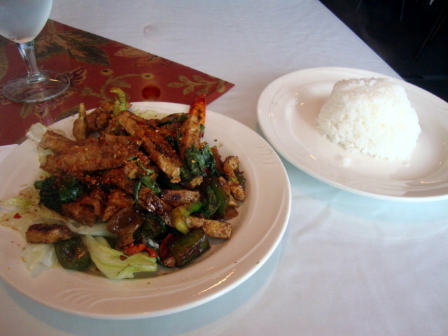 Spicy Tofu – “(comes hot and only hot) fried tofu with green beans sautéed in spicy chili, garlic, and basil.”  I requested mine extra hot and with broccoli thrown in for some extra veggies.