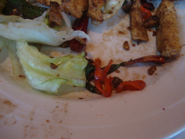 I always pick around the darker dried ones (I had a really bad experience at a Panda Express once) but today I tried one of the soft, bright red pieces.  I spent a minute in tears with a tongue that felt like it had a hole in it, but ended up with a really pleasant spice flavor.  Adam – who used to ardently hate all things hot – even tried one.