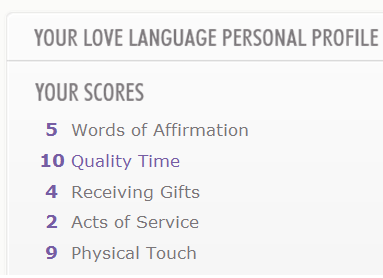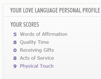 Our friends were talking about the “five languages of love” at brunch so when we got home we decided to take the quiz.  Here are my results –