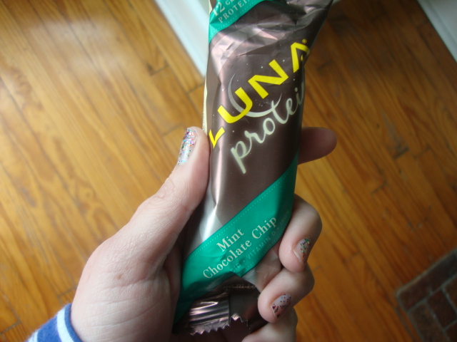 As I headed out the door around 4 pm yesterday I was so hungry I thought I might have a fit. I knew we had plans to grab an early dinner before the health fair but I also knew that I might drive off the road if I didn’t get something to eat. I ended up taking a Mint Chocolate Chip Luna Protein bar from the cabinet.