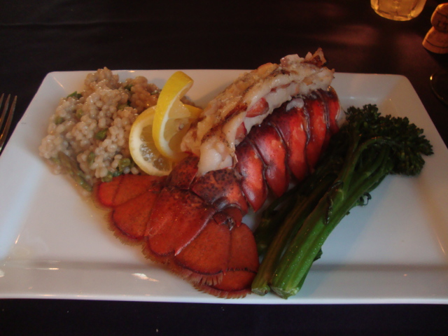 Per usual, we did some sharing with dinner. I got the Grilled Rock Lobster Tail – with lemon and asparagus barley risotto drizzled with a garlic shallot butter and brocoli rabe.