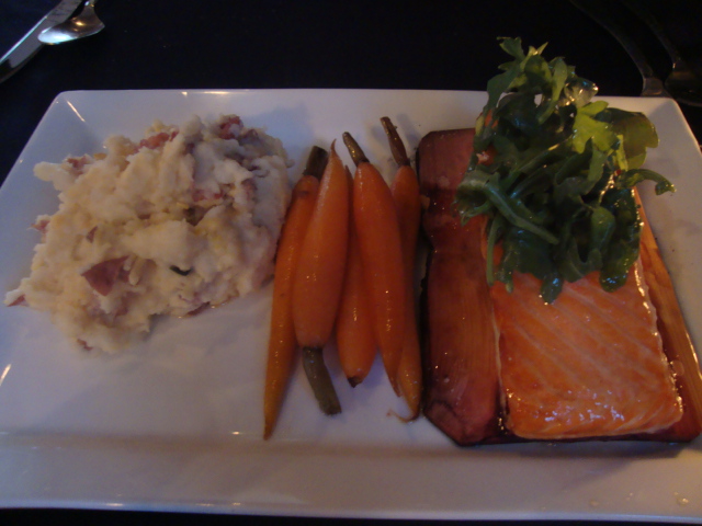 He got the Cedar Plank Salmon – maple candied carrots, fresh arugula, smoked gouda mashed potatoes.
