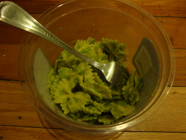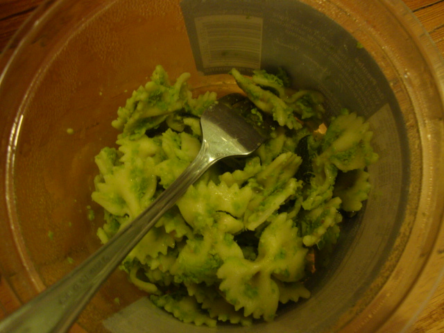 Bow tie pasta and roasted zucchini with peasy pesto, drizzled with 1 Tbsp evoo.