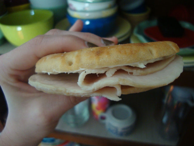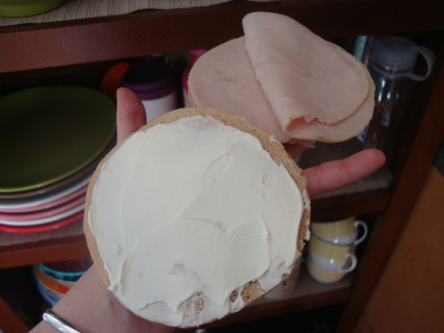 Applegate Farms Honey and Maple Turkey on a sandwich thin with jalapeño cream cheese.