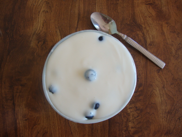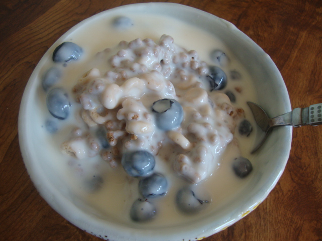 I topped 1 serving of Cheerios and 1 serving of All Bran Bran Buds with blueberries and 1 cup of Lifeway Low-fat Birthday Cake Kefir.