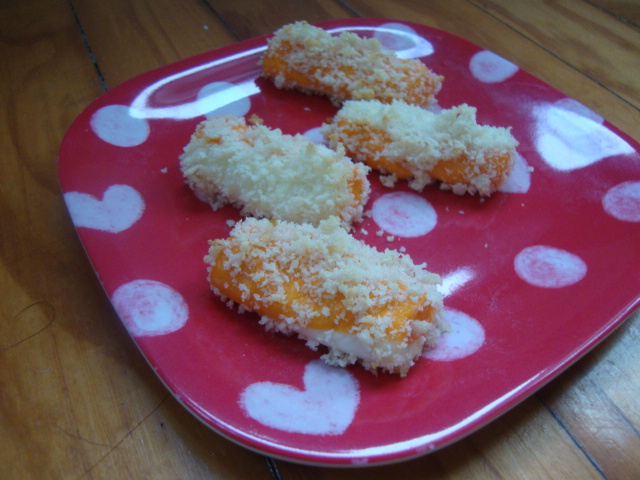 I made an attempt at mozzarella sticks by cutting up string cheese, dipping the pieces in egg white and panko, and baking at 400*.
