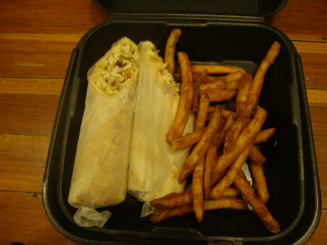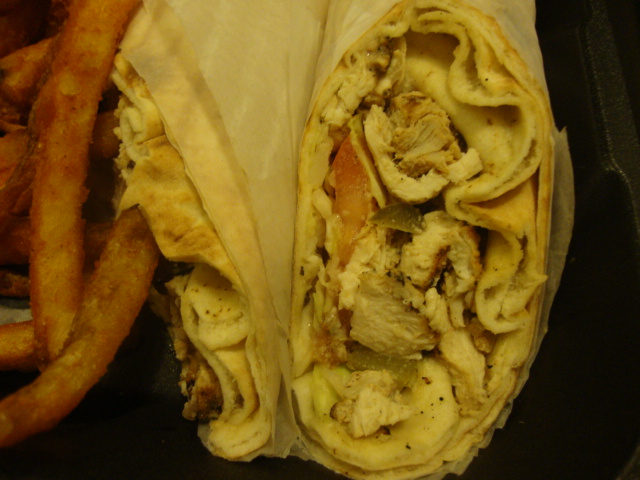 Grilled chicken on a grilled pita with garlic spread, cole slaw, tomatoes, pickles, and tahini sauce. It was great, especially the cole slaw and pickles, but I’d ask for it without garlic sauce next time because my breath was ridiculous.