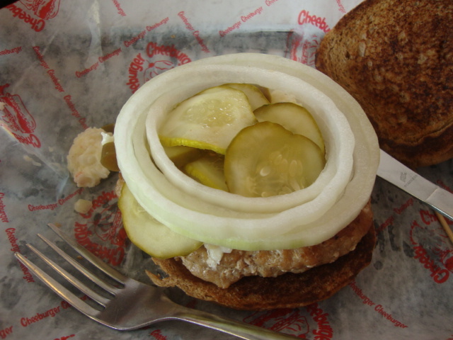 I ordered a turkey burger with cole slaw, pickles, onions, and jalopeños.