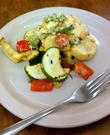 Lunch was eaten in the cafeteria. A Zucchini and Squash Blend with Vegetable Egg Frittata.