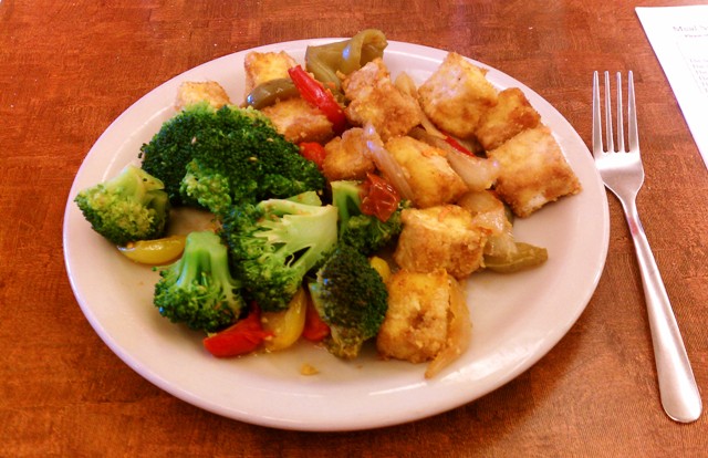 Lunch was from the dining hall again.  Spicy tofu with sautéed peppers and onions plus broccoli cooked with cherry tomatoes.