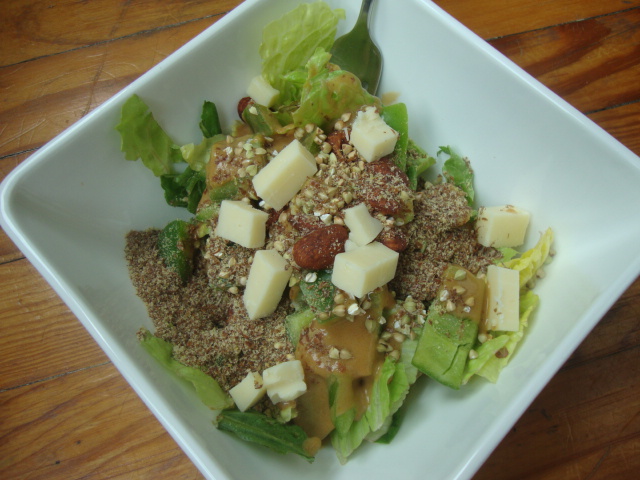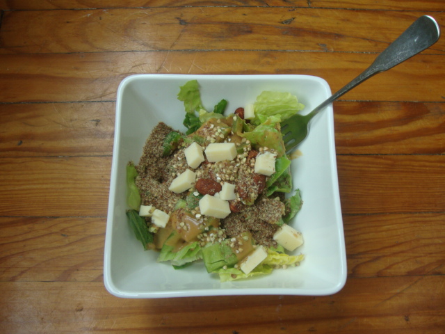 Romaine topped with 2 Tbsp of Wegman’s peanut sauce and 1 Tbsp each buckwheat groats, tamari almonds, flax, and white cheddar.