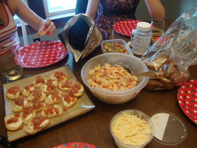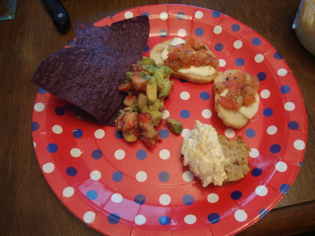 I had bruschetta, cheesy artichoke dip, and strawberry guacamole with blue chips.