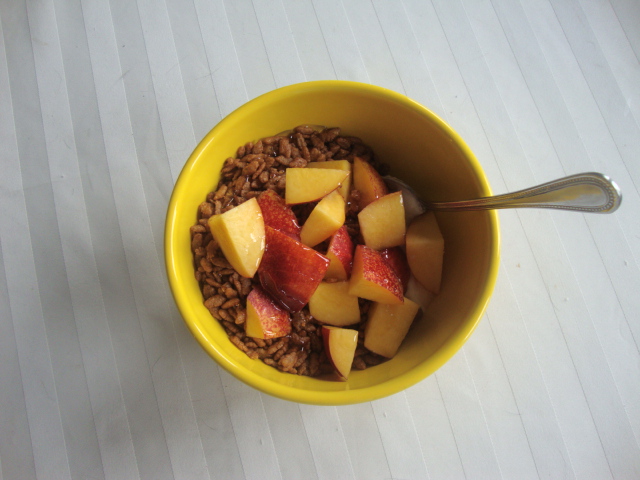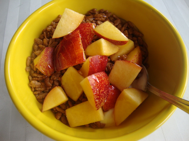A 0% Plain Oikos Greek Yogurt with 1 cup of Erewhon Cocoa Crispy Brown Rice Cereal, a sliced nectarine and a tsp of honey.