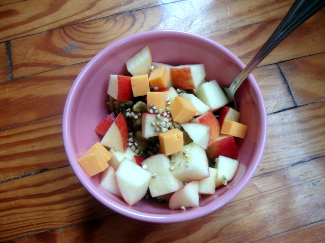 Salad (or a salad-ish dish) for lunch. I topped spinach with peanut sauce, leftover pesto pasta from last Saturday, a sliced Jazz apple, sharp cheddar, and buckwheat groats.
