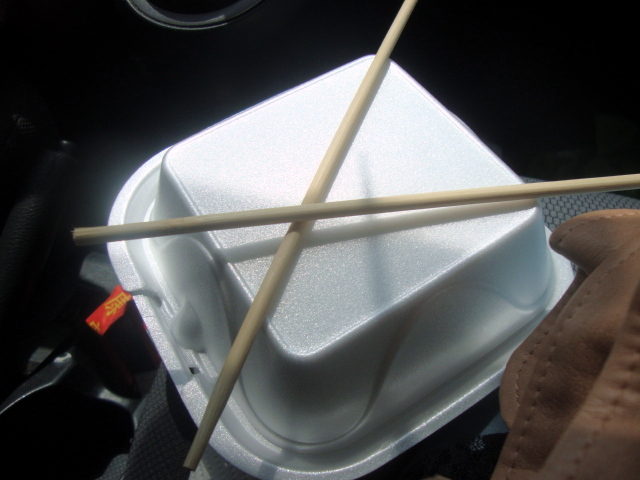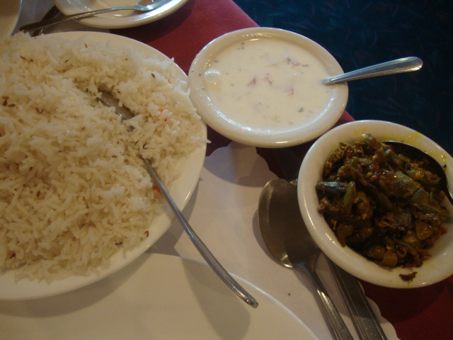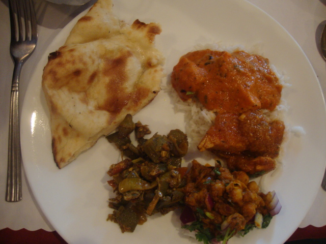 Plate #1 – Naan, chicken makhani, curry chicken, jasmine rice (under the chickens), chana masala, and a pickled okra dish that they gave us on the side.