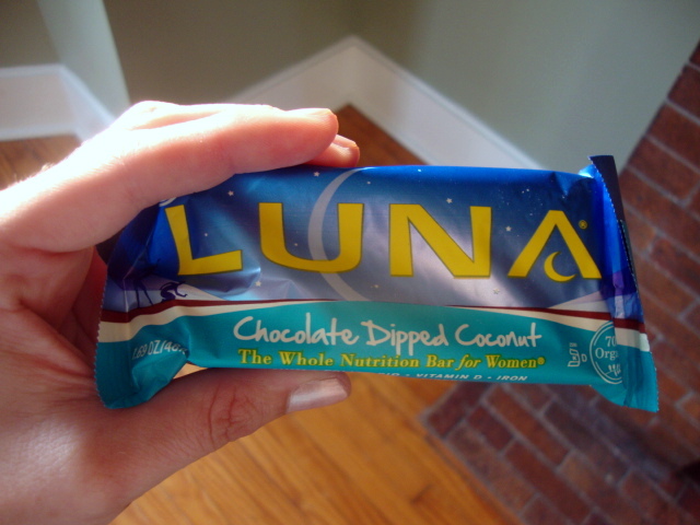 I cut it close but the husband offered to drive me this morning (both walking and driving myself eat up 30 minutes) so I had time to shower and grab breakfast to go. A Chocolate Dipped Coconut Luna Bar,