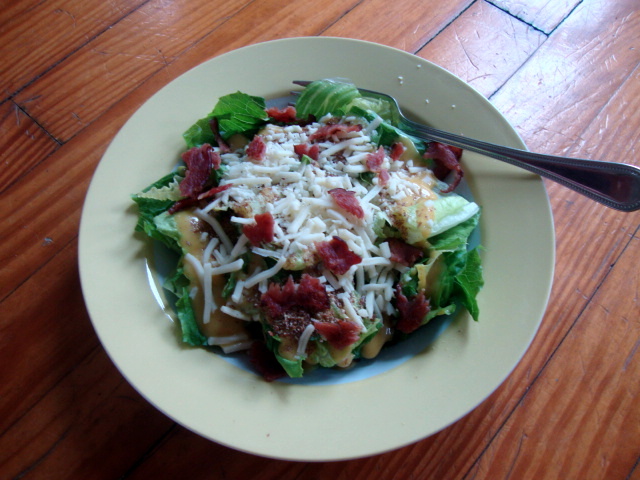A salad of romaine, flax, light honey mustard dressing, a little shredded gruyere, and a crumbled slice of turkey bacon.