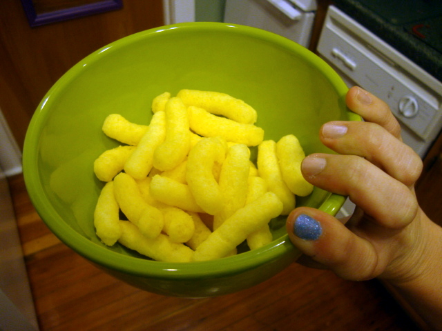 I even pre-made some of the components for tomorrow’s dinner. I snacked on a serving of Barbara’s Baked Cheese Puffs while I cooked.