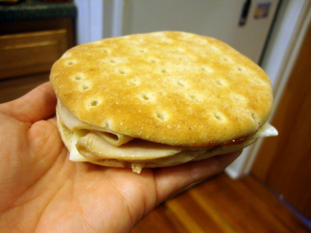 Turkey sandwich – Sandwich Thin, 2 slices of Applegate Farms Smoked Turkey, 1 slice pepperjack cheese, strawberry jam.