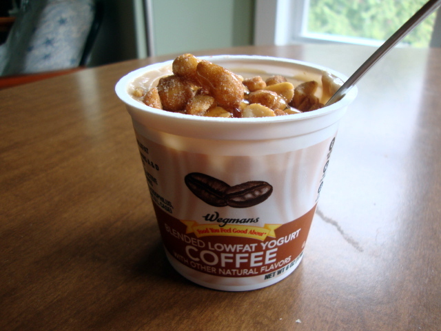 A low-fat coffee yogurt with honey-roasted peanuts and honey.