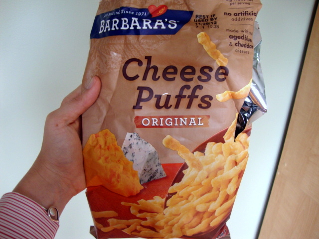 The last of these Barbara’s cheese puffs, about half a serving. Funny story – Adam had a friend over (just one) on Monday. He bought two bags of snacks, the cheese puffs and some salt and vinegar chips. All that was left is what I ate today, and that only survived because he knew I wanted to taste them.