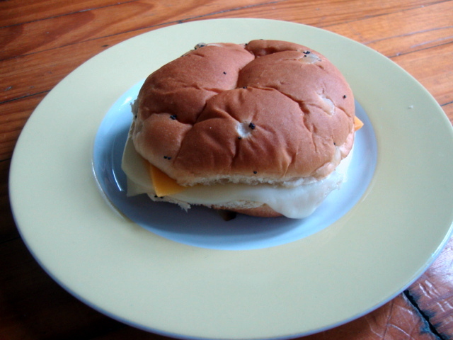 A cheese sandwich – an onion roll with about 2 oz of melted cheese (a mix of extra-sharp cheddar, 2% swiss, and 2% provolone).