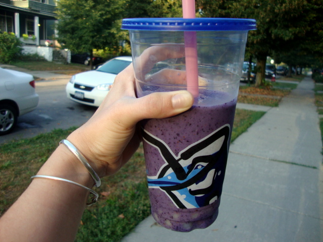 I had a fun and fancy(-free!) smoothie for breakfast. Taro milk powder, frozen blueberries, and Blue Diamond Almond/Coconut Milk Blend.