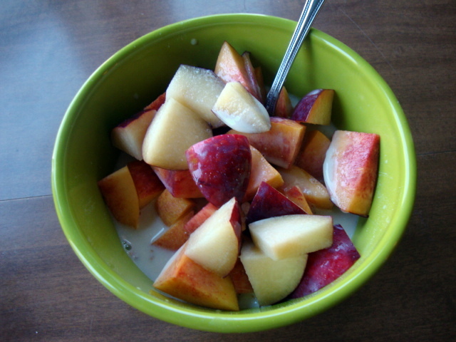 1 serving of Vanilla Almond Special K with Tempt vanilla hemp milk, chopped plum and nectarine, and 1.5 Tbsp chunky honey peanut butter.