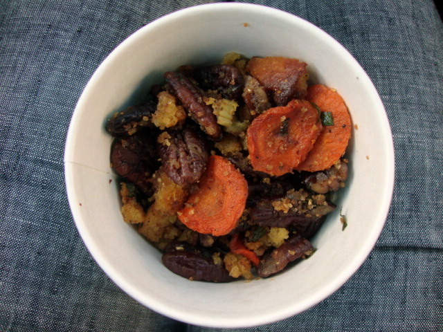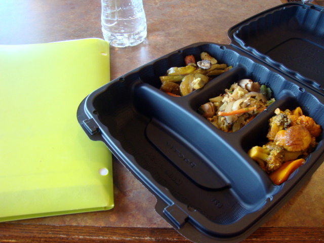 I ate a late lunch during my afternoon errands. Vegan pecan cornbread stuffing from the co-op.