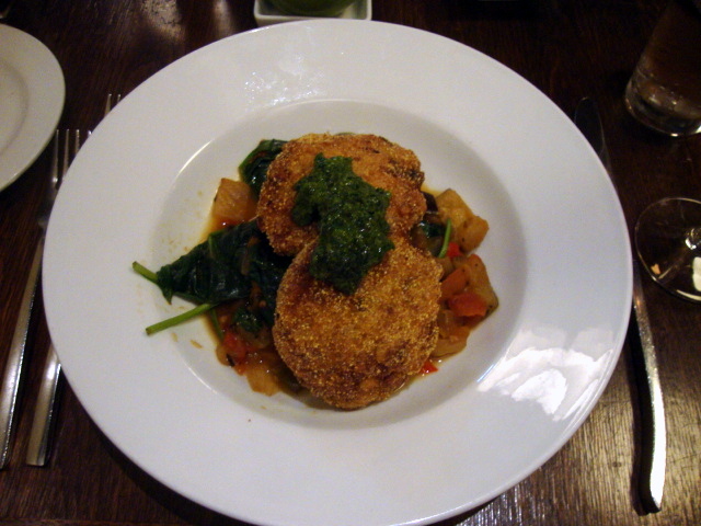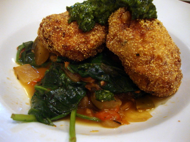 Corn Risotto Croquettes ratatouille, sautéed spinach, basil-parsley salsa verde.