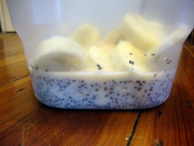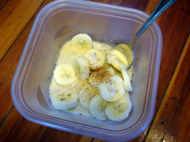 My breakfast was so good it was worth breaking holiday timelines. 1/3 cup raw oats, 2/3 cup vegan nog, and 1 Tbsp chia seeds sat overnight. This morning I topped it off with a sliced banana, nutmeg, and a little more nog. Dee-lish-us!