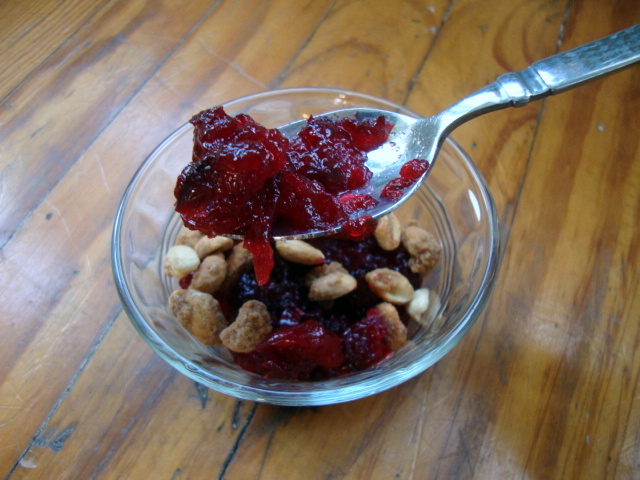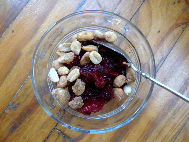 I made cranberry sauce from scratch yesterday! I used this recipe and it came out great. Today I ate a bowl with sweet and salty peanuts.