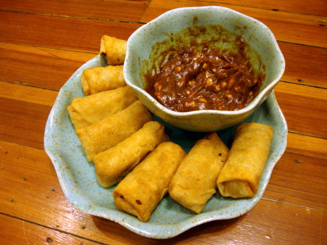 Adam and I shared a box of Thai spring rolls (with homemade spicy peanut sauce) while we played.