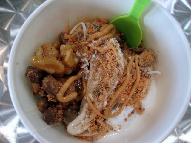 I got taro, almond butter, and pecan pie froyo topped with sprinkles and sweetened condensed milk.