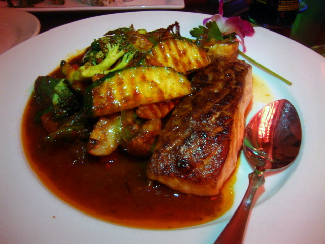 For my meal I got grilled salmon with sautéed vegetables in basil sauce, ordered Thai-spicy.