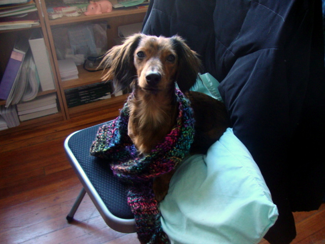 I take it back, Mom. Apparently* Webster didn’t want to eat my scarf, he wants you to knit him one of his own!